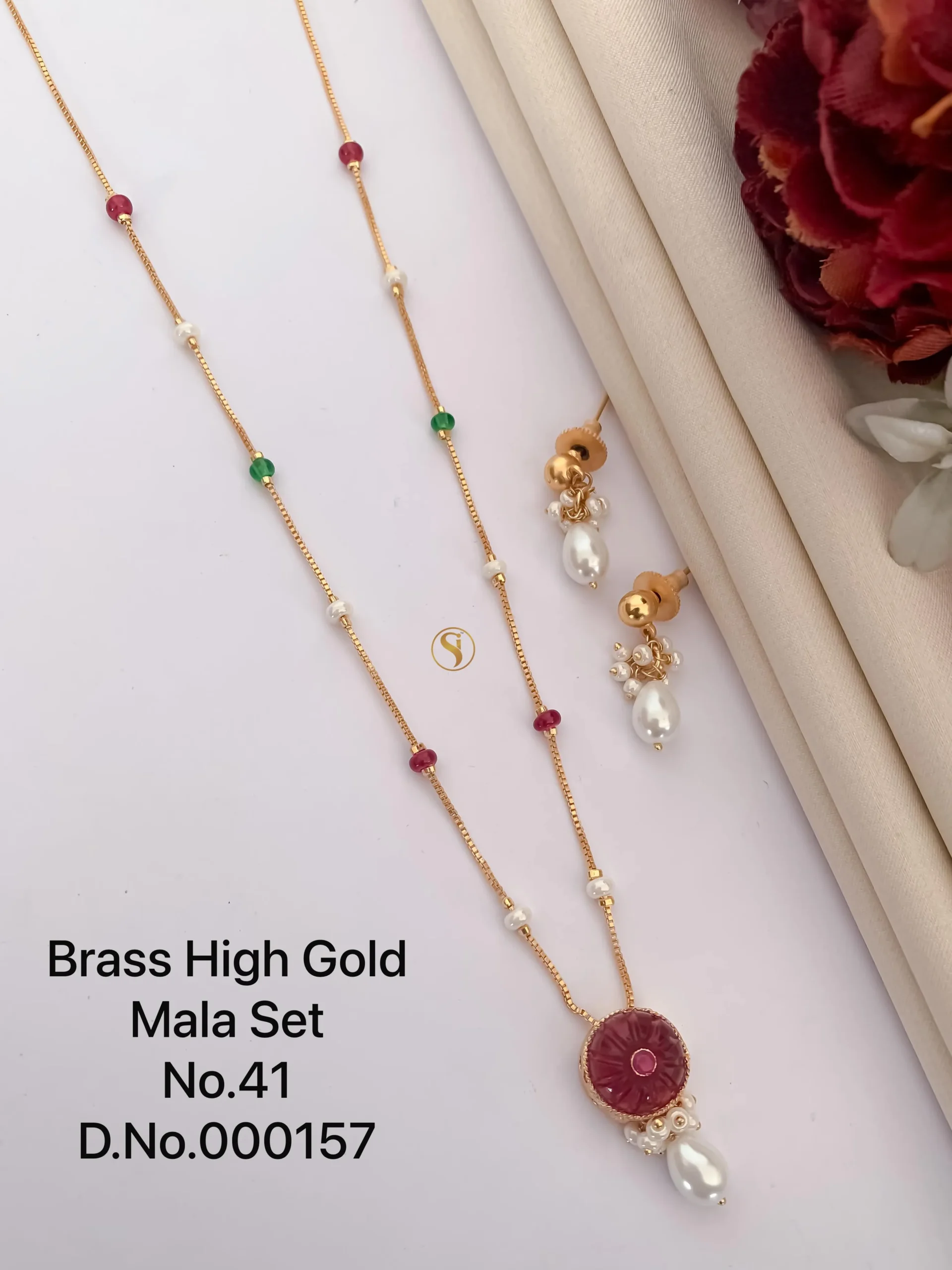 Brass high gold mala set with pearl and multicolour beads