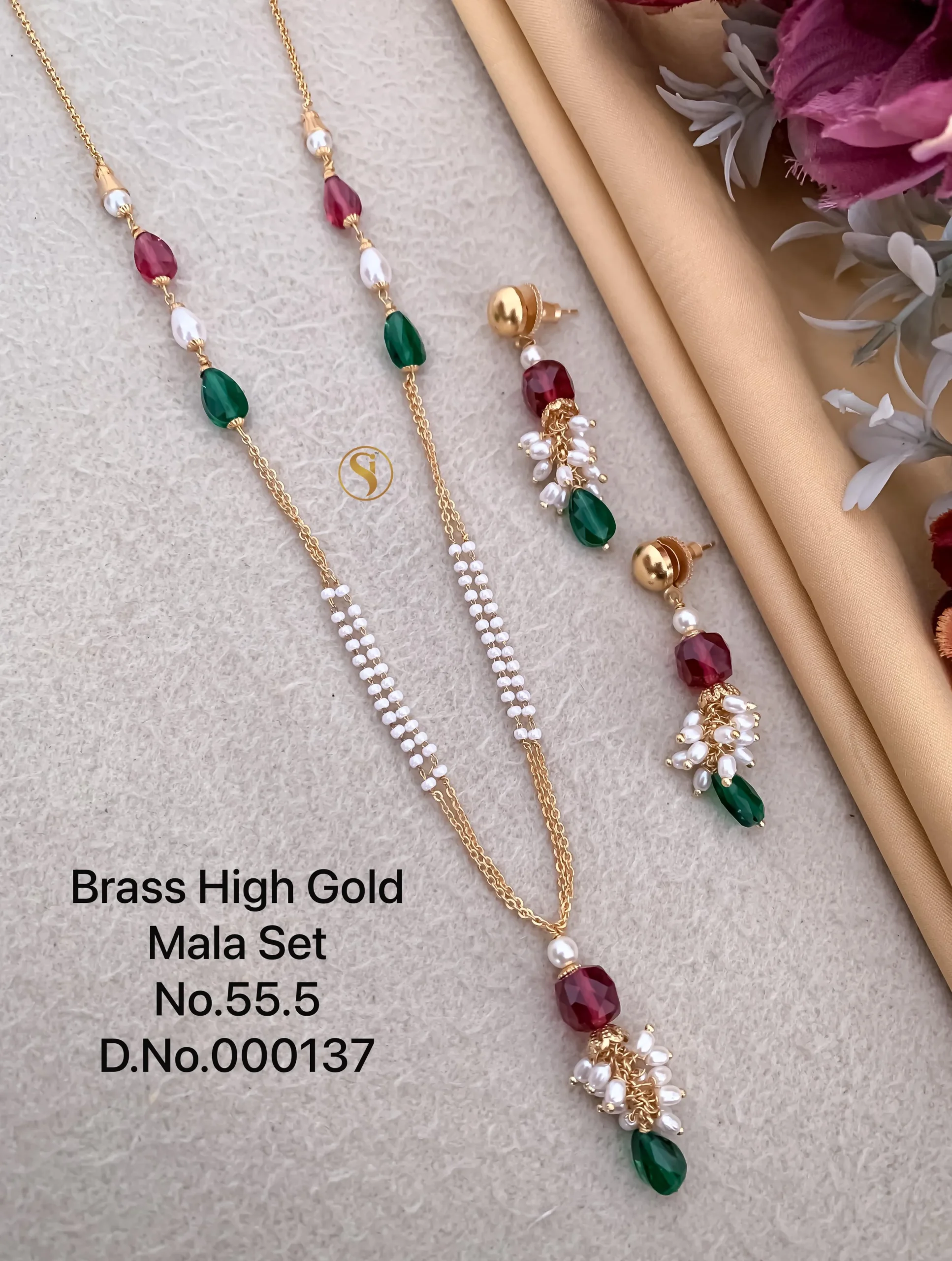 Brass high gold mala set with ruby green and pearl drops