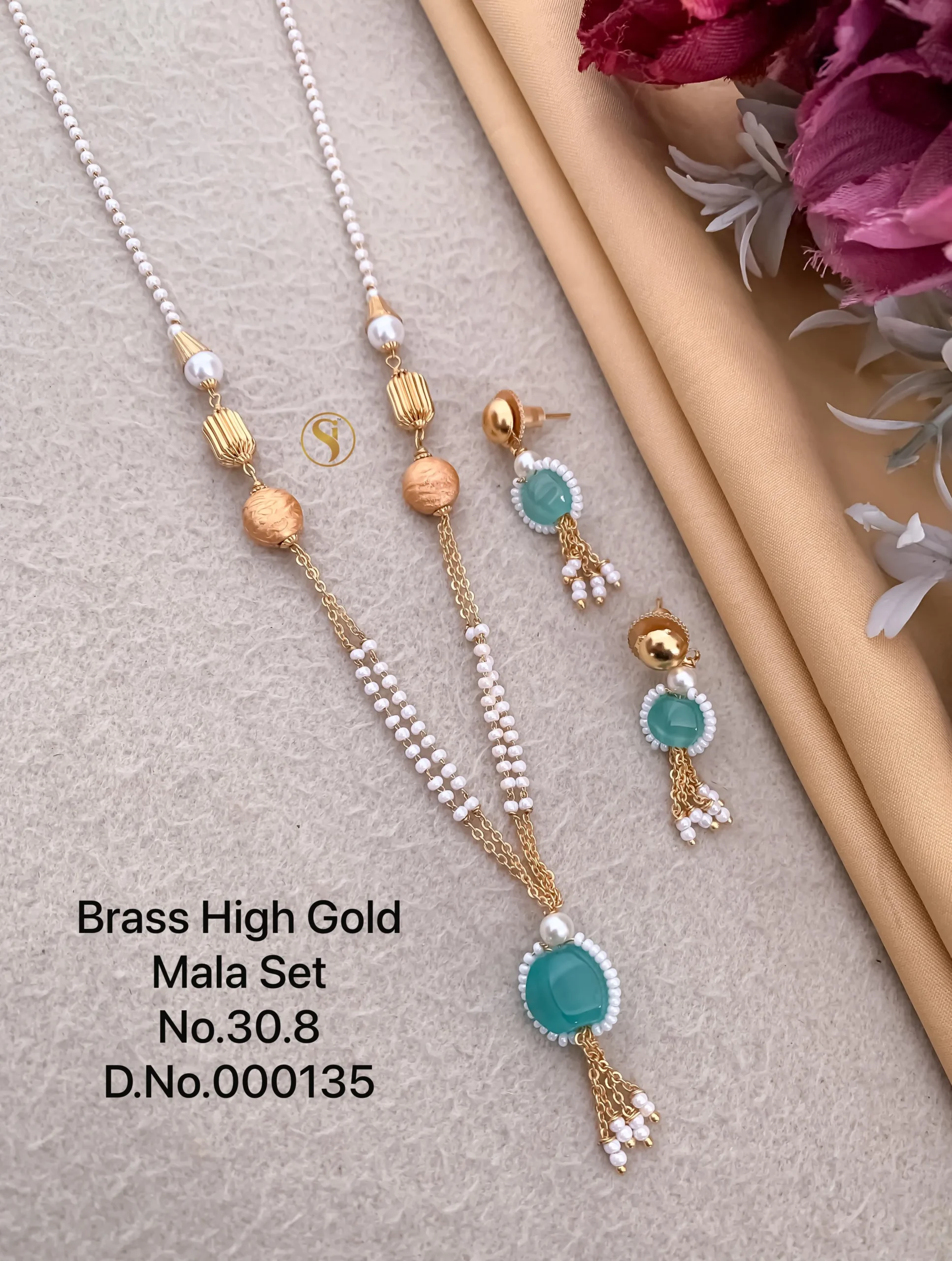 Brass high gold mala set with premium pearl and aqua stone