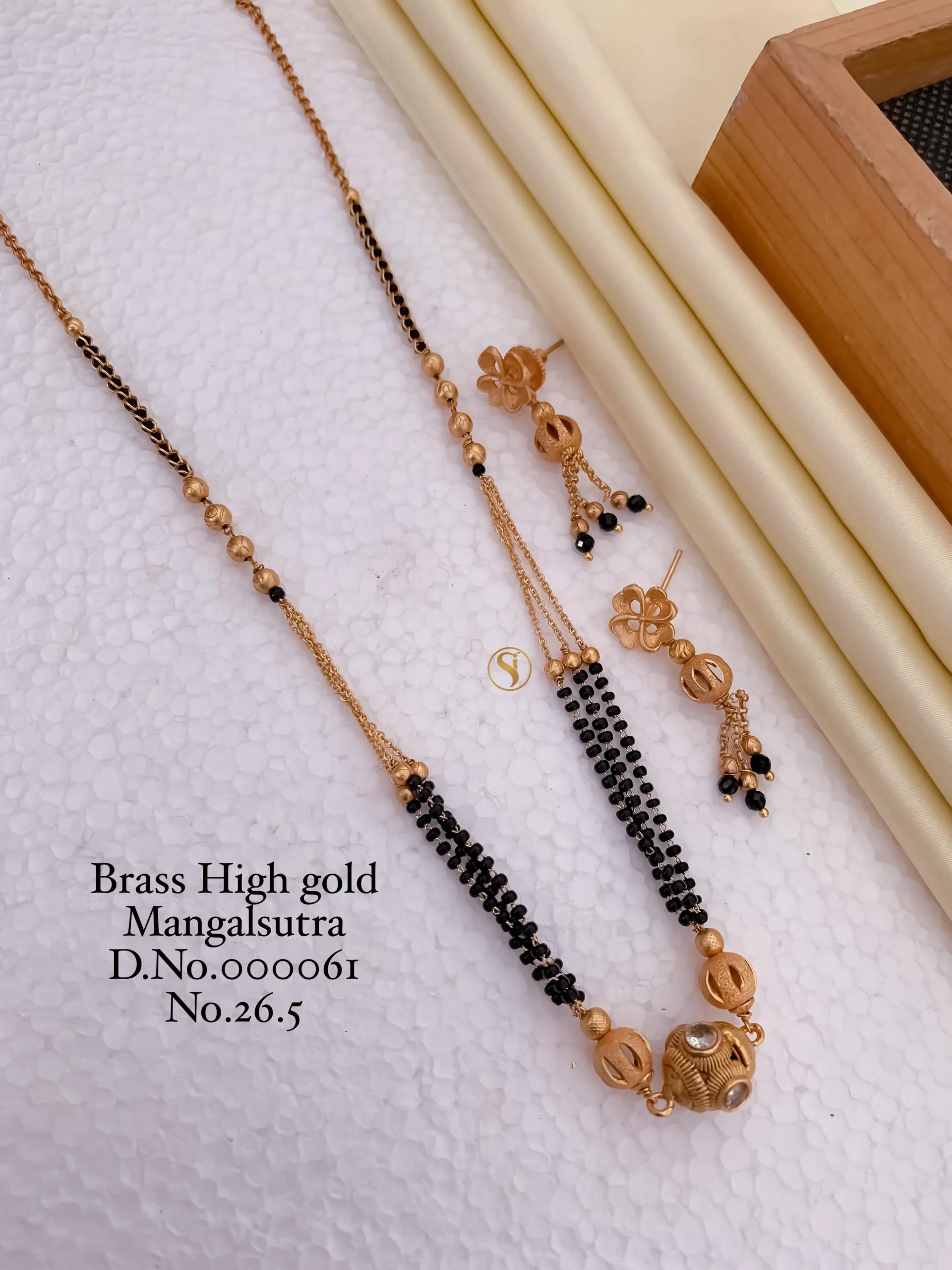Brass high gold mangalsutra crafted with traditional black beads and elegant detailing, designed to add a classic touch to everyday styling. This timeless piece features intricate beadwork, smooth finishing, and a lightweight feel that makes it perfect for daily wear or special family occasions. The matching earrings enhance its beauty and complete your ethnic look with grace.