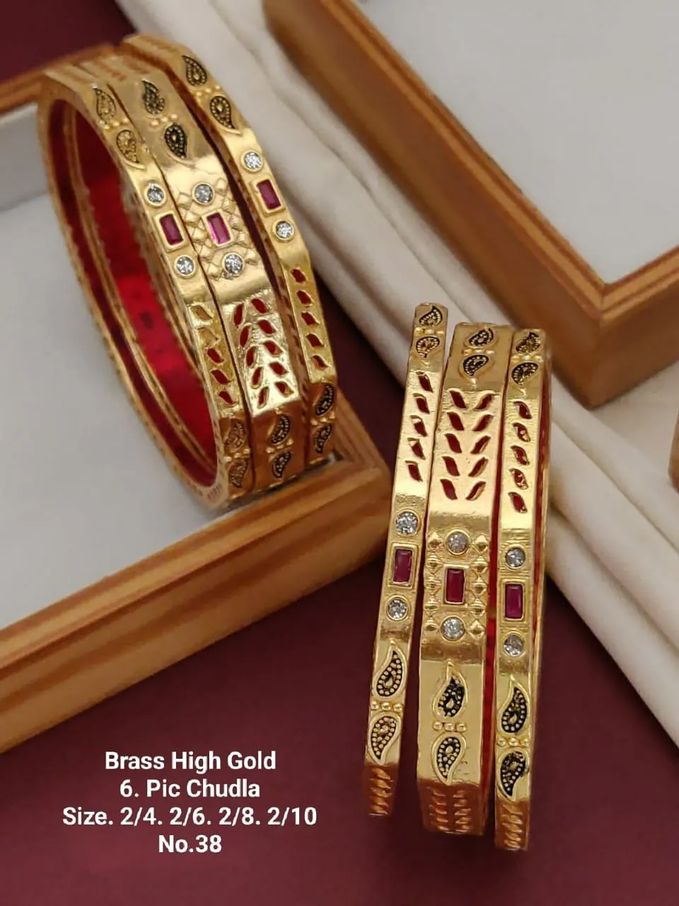 Brass high gold chudla bangles with slim rectangular profile red interior black paisley enamel and sparkling white stones creating a modern traditional fusion look suited for parties and special events.|Details:|- Metal: Silver +alloy with Premium Polish|- Closure:size 2.4/2.6/2.8|- SKU Code: JG_BGL_00 (88)