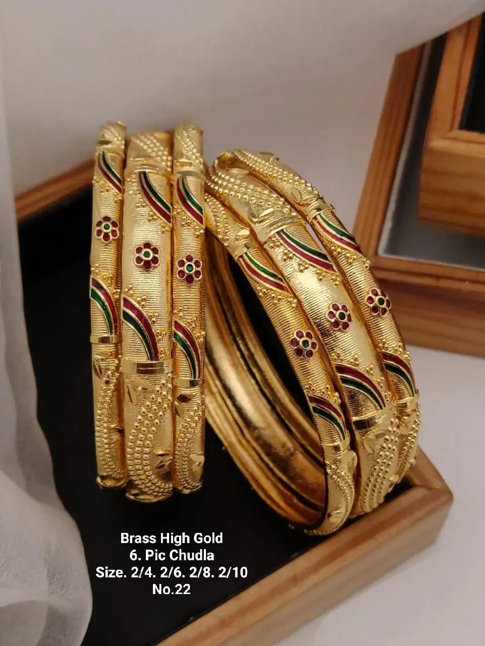 + Free ShippingHigh gold floral chudla bangles crafted with multicolor enamel detailing and fine carved texture offering a premium ethnic look perfect for weddings festive styling and daily traditional wear.|Details:|- Metal: Silver +alloy with Premium Polish|- Closure:size 2.4/2.6/2.8|- SKU Code: JG_BGL_00 (71)