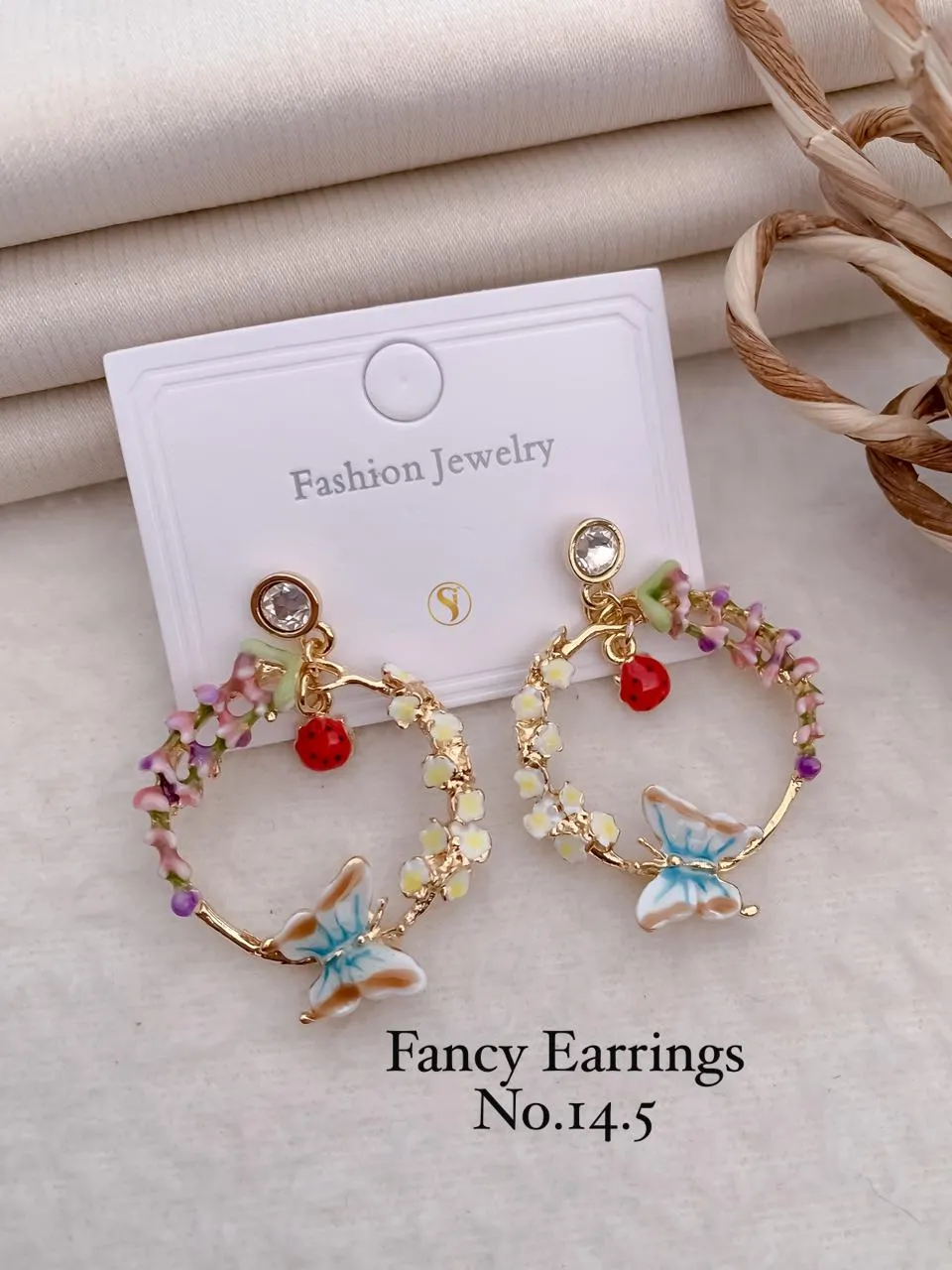 These butterfly and ladybird hoop earrings feature enamel charms pastel flowers and crystals creating a playful stylish accessory Why You’ll Love It: The butterfly and ladybird motifs add a cheerful lively look perfect for casual wear and gifting Jewelry Care: Keep dry avoid perfume wipe gently and store separately