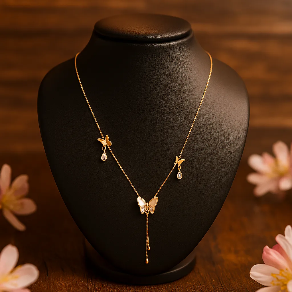 An elegant butterfly design necklace crafted with a radiant gold polish, featuring multiple butterfly motifs embellished with cubic zirconia stones. Its adjustable chain ensures a perfect fit for any neckline, making it ideal for both festive and casual occasions. The lightweight design adds comfort without compromising on the luxurious appeal, giving you a timeless jewelry piece.