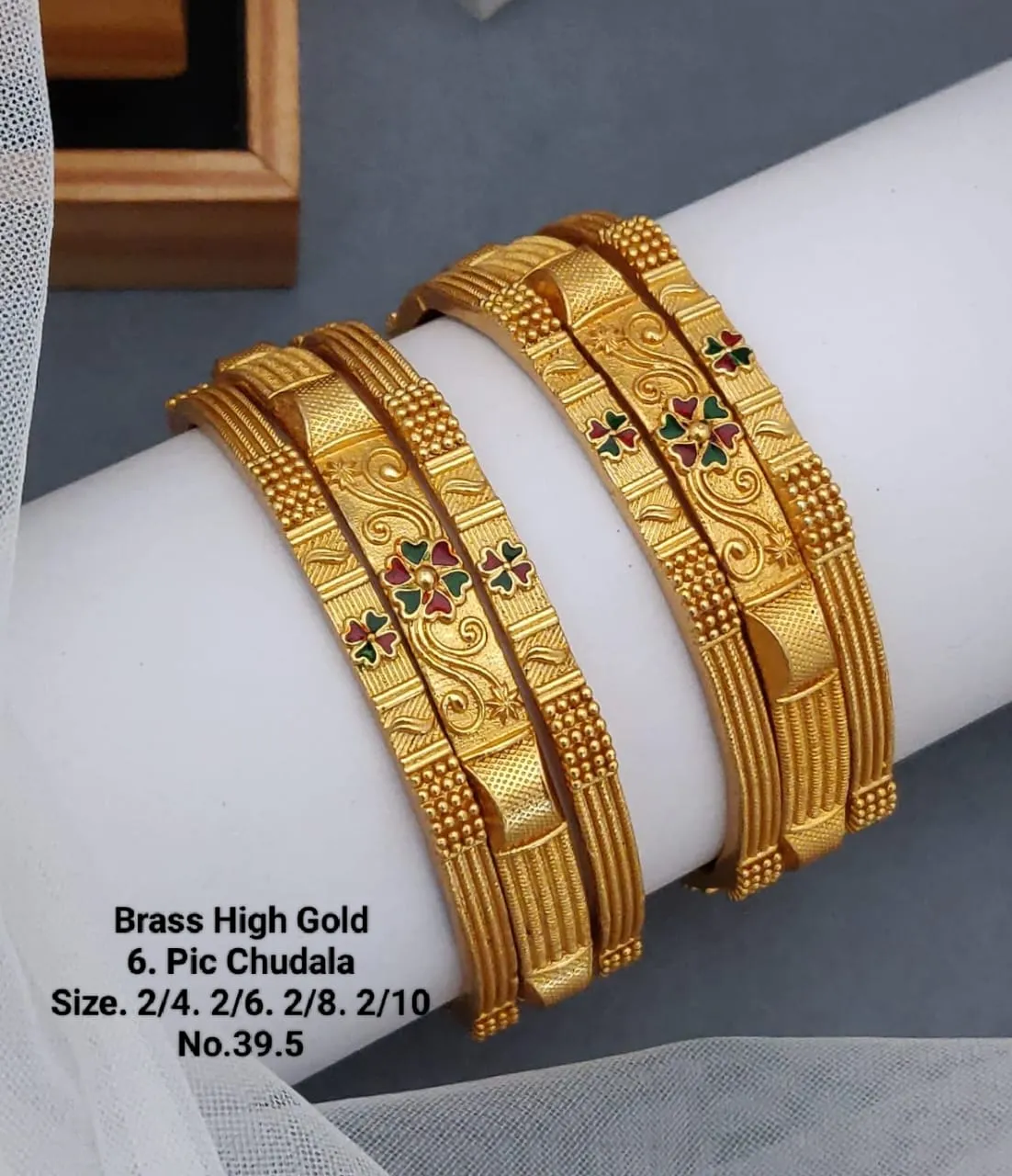 These high-gold bangles with blue stone floral centers and engraved detailing provide a classy traditional aesthetic suitable for weddings, festivals and daily ethnic styling. The handcrafted patterns add heritage beauty to any outfit.\nWhy You’ll Love It: The blue stone detailing adds a refreshing modern twist to traditional jewellery. Lightweight yet elegant, perfect for women who love versatile festive accessories.\nJewelry Care: Keep dry. Wipe with soft cloth and store separately.