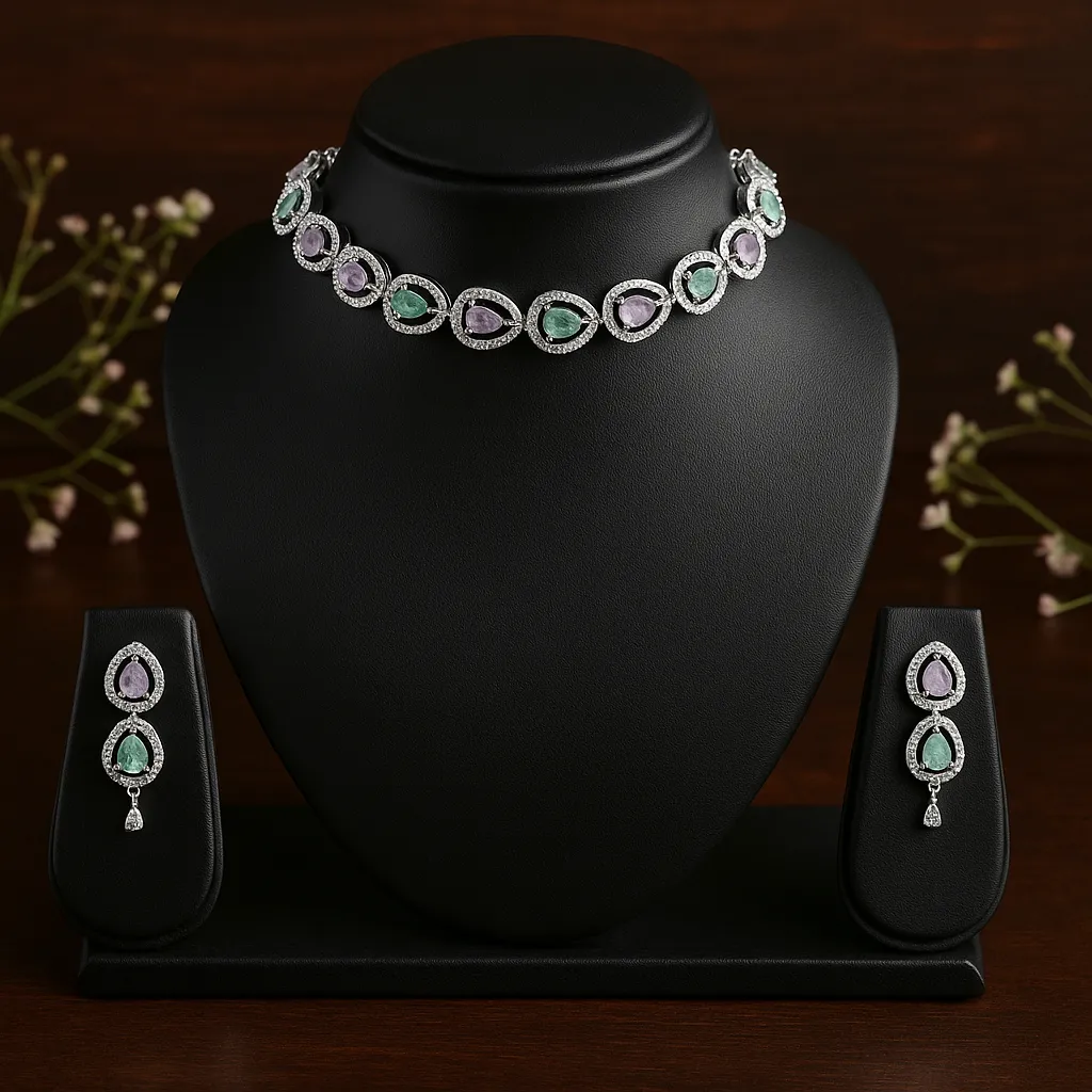 Dual-tone emerald and amethyst diamond choker necklace with fine crystal border detailing perfect for festive and contemporary styles.|Details:|- Metal: Silver + alloy with Premium Polish|- Closure: adjustable|- SKU Code: FMSNCLS0 (3)