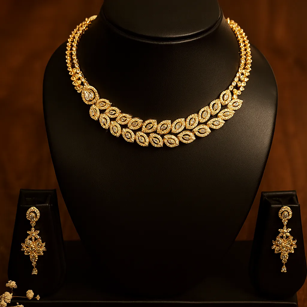 An elegant gold leaf motif necklace set designed with twin layers of marquise-cut stones for a refined and graceful appeal. Its intricate detailing and polished gold finish bring a timeless charm that complements both modern and traditional ensembles. Perfect for weddings, festive wear, and evening functions. Why You’ll Love It: The dual-layered leaf design symbolizes beauty and renewal, adding natural elegance to your neckline. Lightweight yet luxurious, this necklace blends subtle glamour with high sophistication, making it suitable for women who adore minimalist opulence. Jewelry Care: Avoid moisture and sprays. Clean gently with a soft dry cloth and store in a dry box.|