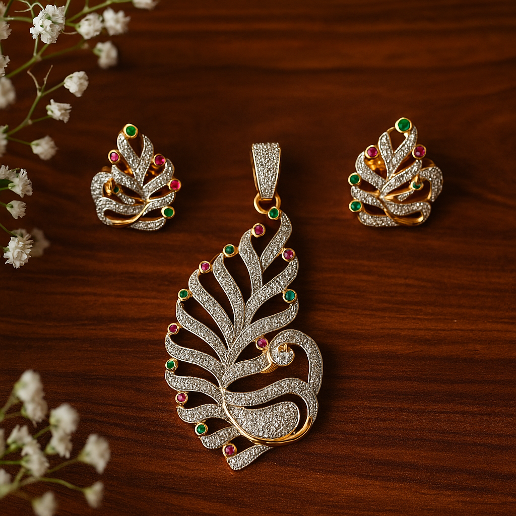 peacock-inspired pendant set designed with dazzling cubic zirconia stones,