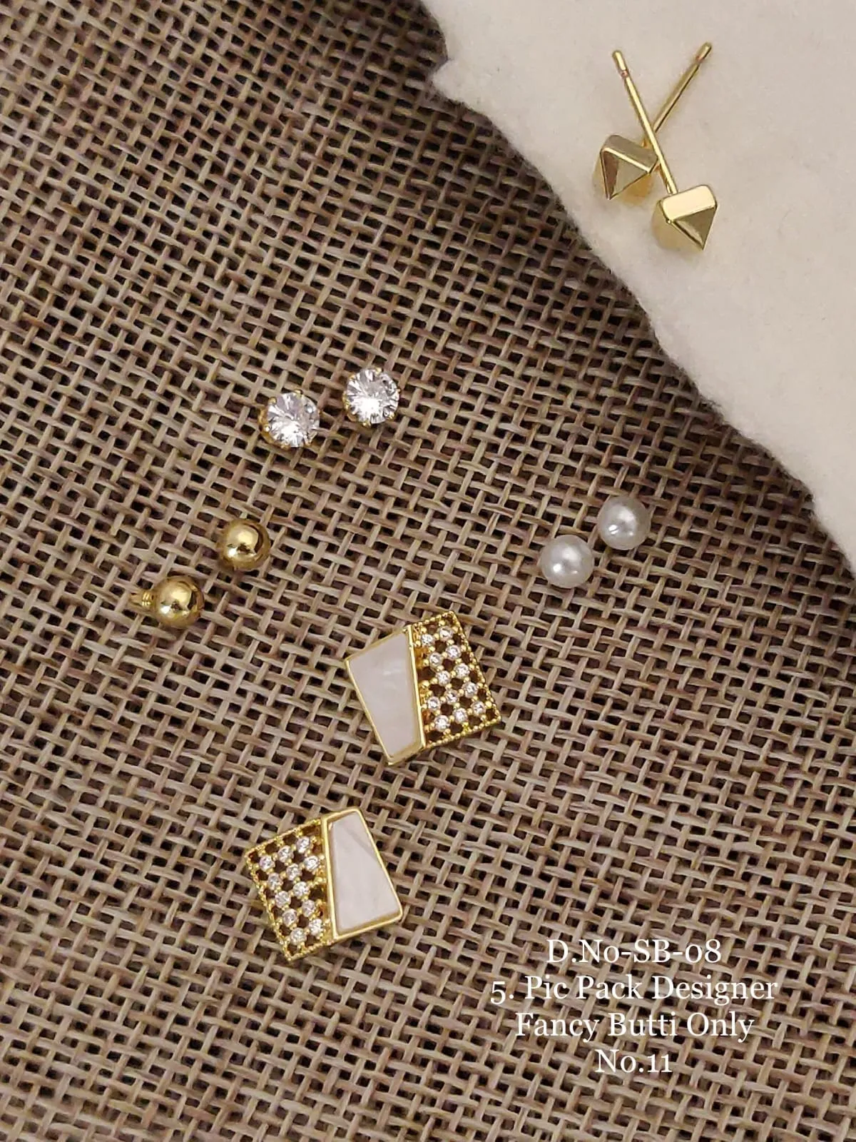Five-pair designer butti pack with mixed studs including pearls, crystals, gold balls, and a premium stone-set butti, perfect for office, college, and daily wear.|Details:|- Metal: brass+Silver +alloy with Premium Polish|- Closure: push back|- SKU Code: JG_ER_0 (45)