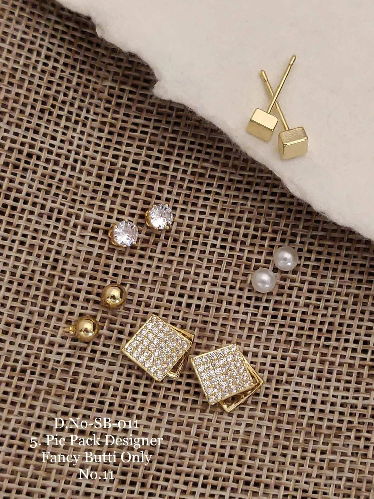 Five-pair square crystal designer stud pack with sparkling square buttis, pearls, gold balls, and crystal studs for elegant everyday styling.|Details:|- Metal: brass+Silver +alloy with Premium Polish|- Closure: push back|- SKU Code: JG_ER_0 (50)