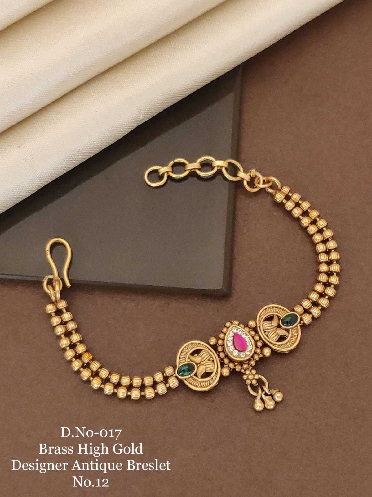 + Free ShippingThis antique bracelet highlights a teardrop pink centre stone with two elegant circular motifs, offering a regal ethnic appeal. Lightweight and richly detailed, it pairs perfectly with sarees, lehengas, and festive suits.|Details:|- Metal: brass+Silver +alloy with Premium Polish|- Closure: adjustable|- SKU Code: JG_BRCLT_0_48