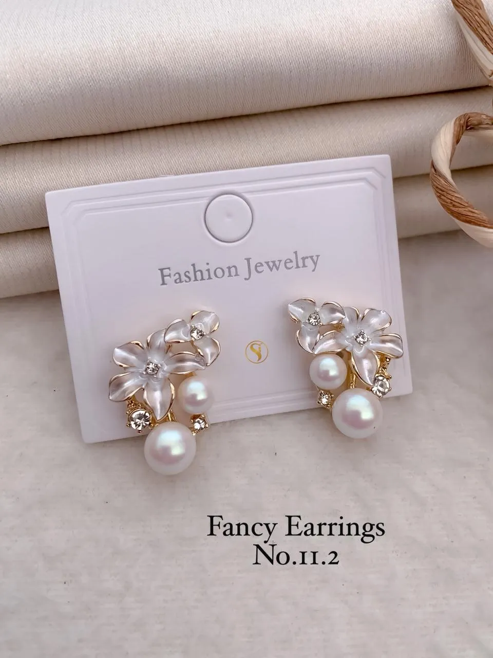 Luxury pearl floral earrings combining glossy pearls, crystal stones and delicate flowers, ideal for weddings, parties and premium traditional or Indo-western looks.|Details:|- Metal: brass+Silver +alloy with Premium Polish|- Closure: push back|- SKU Code: JG_ER_0 (19)