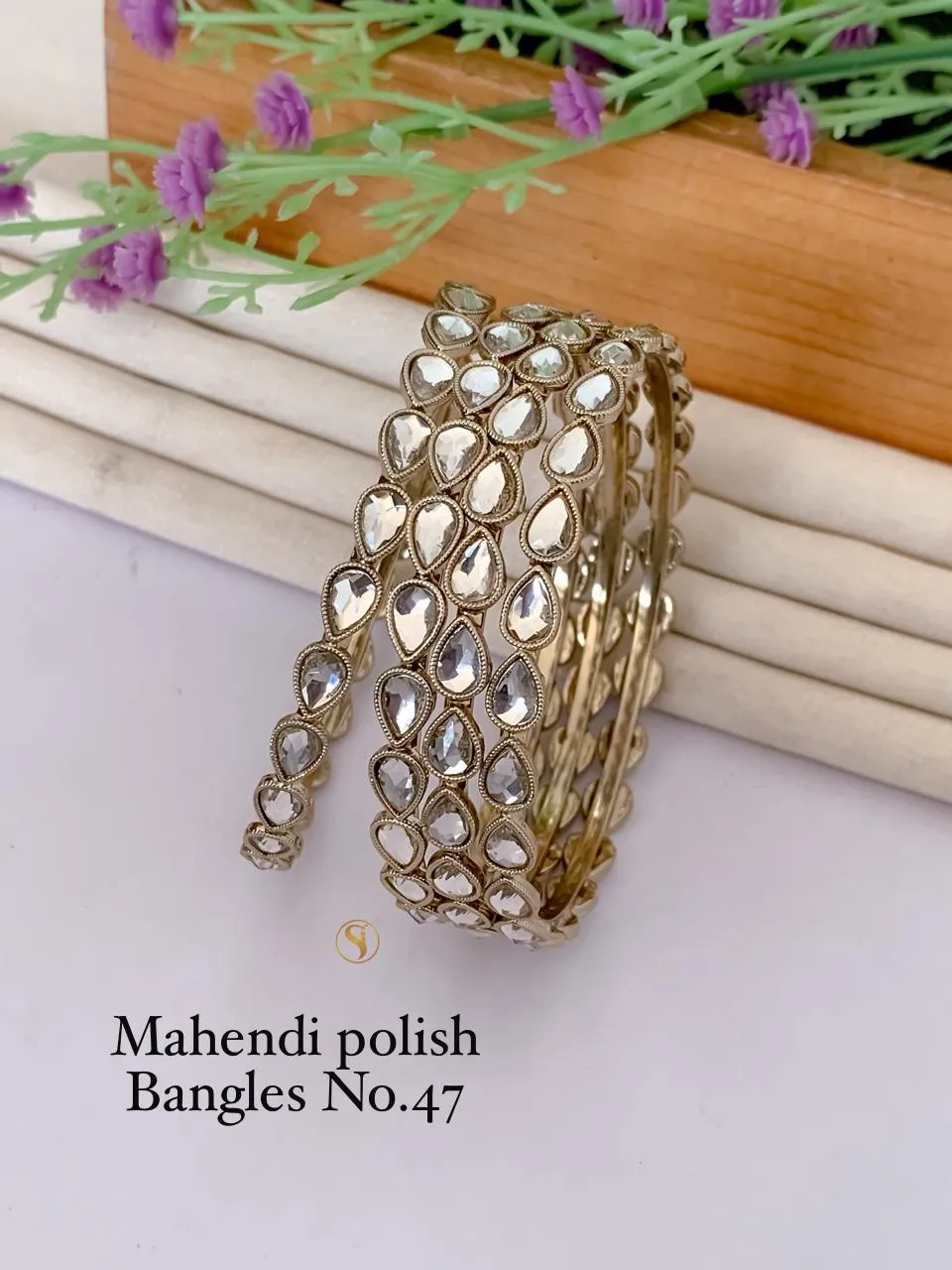 Premium mahendi polish bangles crafted with mirror-finish kundan stones arranged in teardrop pattern offering bright reflective shine ideal for festive and bridal wear.\nWhy You’ll Love It: Adds sparkling royal touch through kundan shine and handcrafted details.\nJewelry Care: Avoid moisture and sprays. Clean with dry cloth.