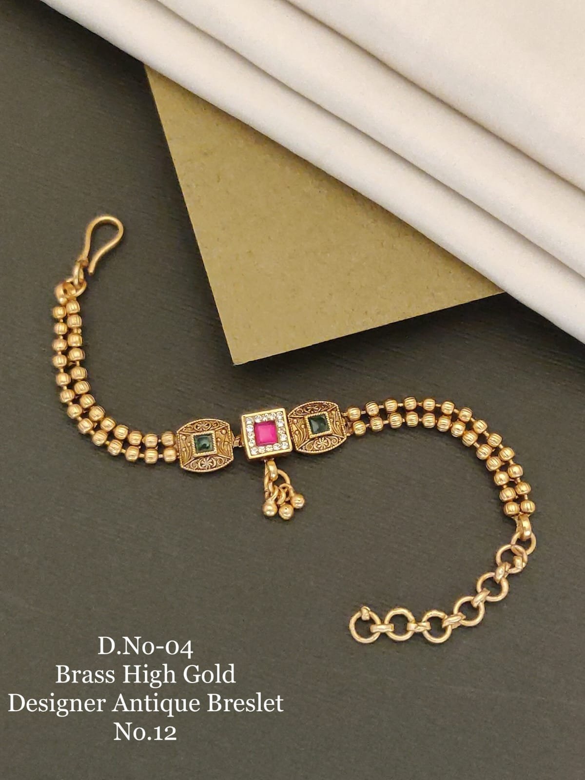 This designer beaded antique bracelet features dual green stone settings paired with a rich high-gold finish. Its minimal yet elegant style makes it suitable for everyday ethnic wear, festive outings, and simple family functions.