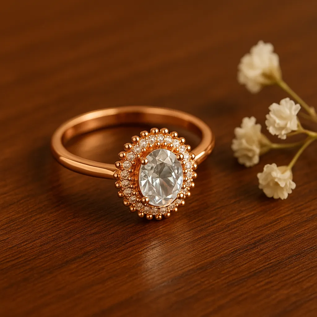 brilliant oval CZ centerpiece is surrounded by a delicate halo of smaller
