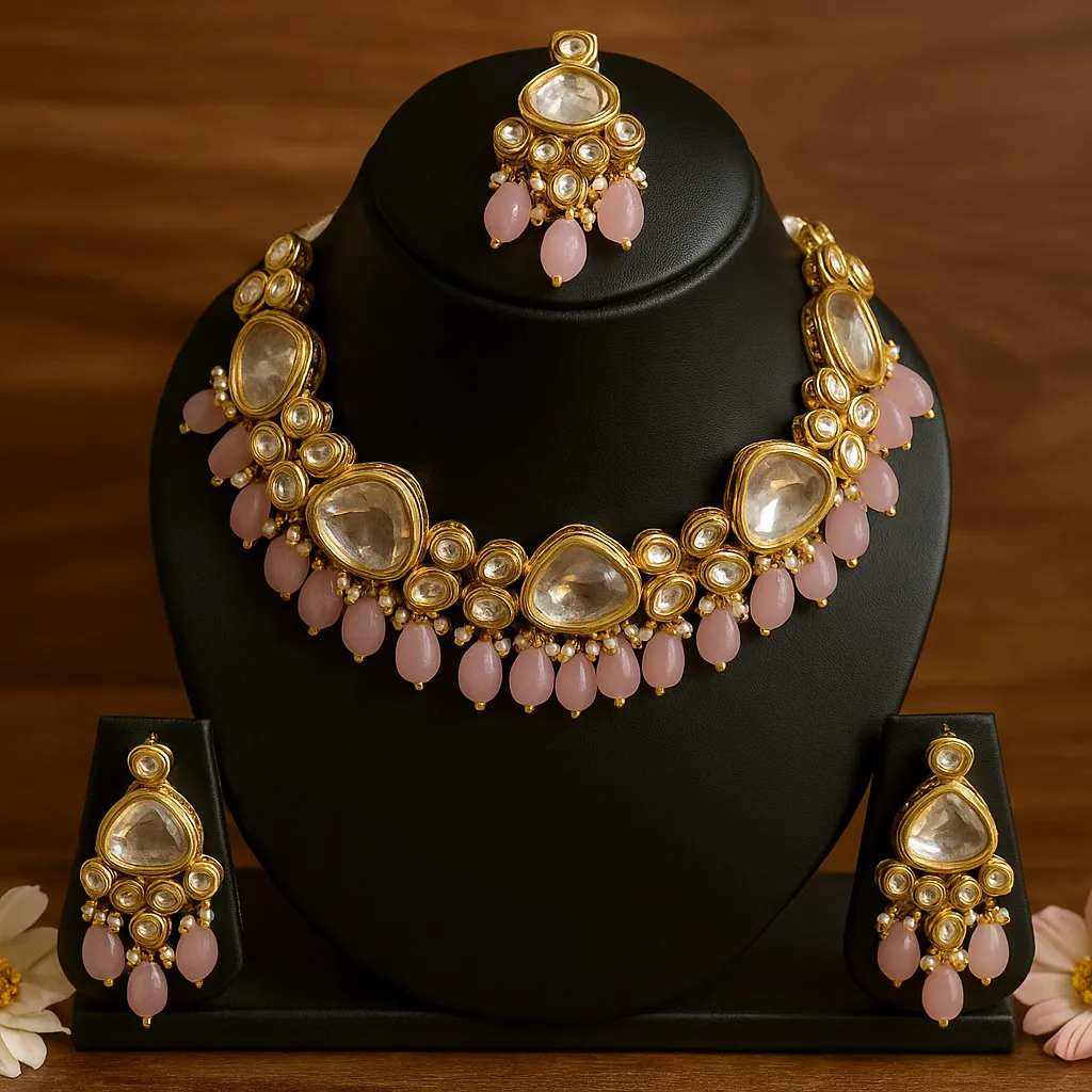 A royal kundan choker necklace adorned with large rose-pink stones and drop accents. The golden framework showcases classic craftsmanship, reflecting rich tradition and festive grandeur. Perfect for weddings, cultural events, and royal-inspired celebrations. Why You’ll Love It: The blend of rose-pink and gold exudes a regal aura that enhances bridal or festive attire. Each stone is carefully set to create symmetry and brilliance, ensuring you shine with elegance and poise. Jewelry Care: Keep away from direct sunlight and water. Wipe softly after every wear and store safely to prevent scratches.|