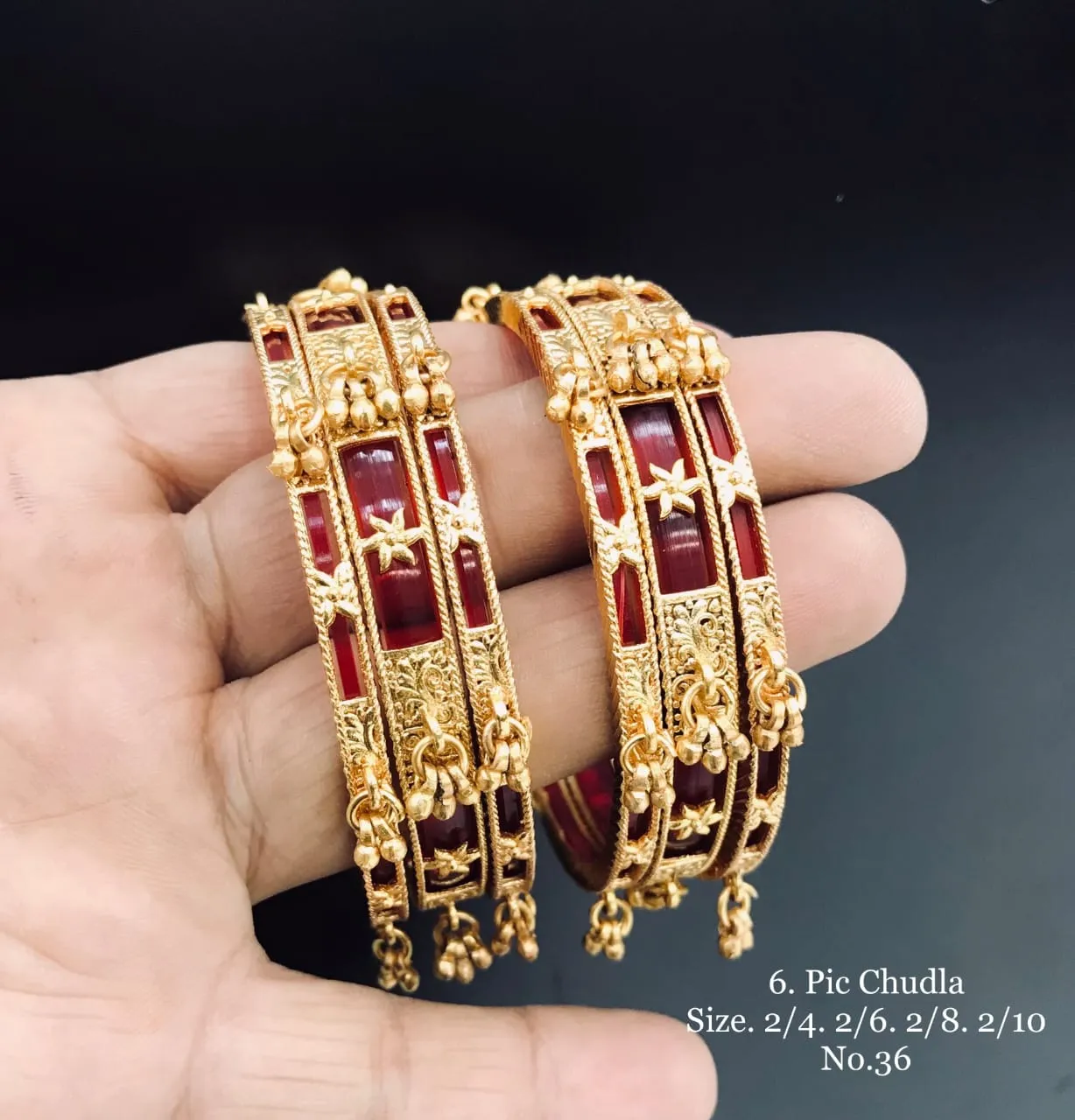 Traditional red chudla bangles featuring stone accents and premium antique gold finish ideal for weddings cultural celebrations and festive ethnic wear.\nWhy You’ll Love It: These bangles deliver a classic bridal-inspired look making them perfect for women who love timeless ethnic jewellery that never goes out of style.\nJewelry Care: Keep dry avoid perfume contact clean gently and store separately.